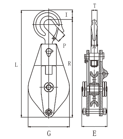 1、滑轮,采用精致铸钢轮,较之铸铁轮更加安全耐用。 2、合页,优质低碳合金钢锻造而成。并经过科学热处理,进而得到较高的综合强度和耐用度。 3、吊钩,经过精心设计,采用优质