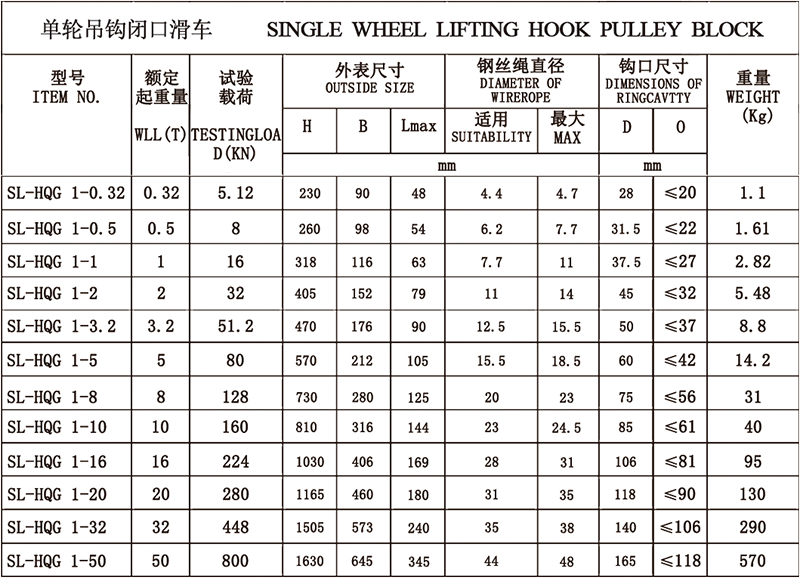 1、吊钩特点:优质合金钢模锻而成,3倍安全系数。 2、滑轮:铸铁滑轮、铸钢滑轮、热轧滑轮。 3、滑轮套芯:复合耐磨铜套、纯铜套、滚珠轴承、滚针轴承。 4、其他吨位可以定做。